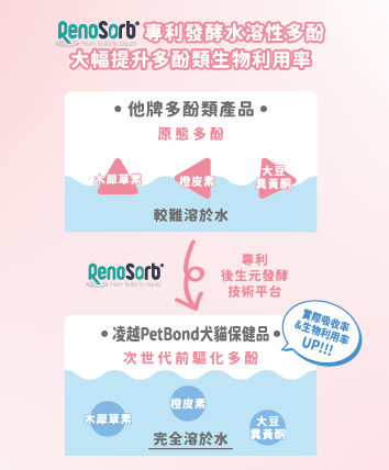 凌越生醫PetBond採用專利水溶性多酚,大幅提升多酚類生物利用率。