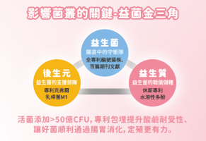 影響菌叢的關鍵- 益菌金三角,讓好菌順利通路腸胃消費,定殖更有力。